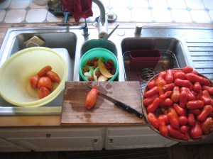 Practice makes perfect. After decades of peeling, bagging, and freezing tomatoes, I’ve got a bit of a system. Here it is, for your consideration.