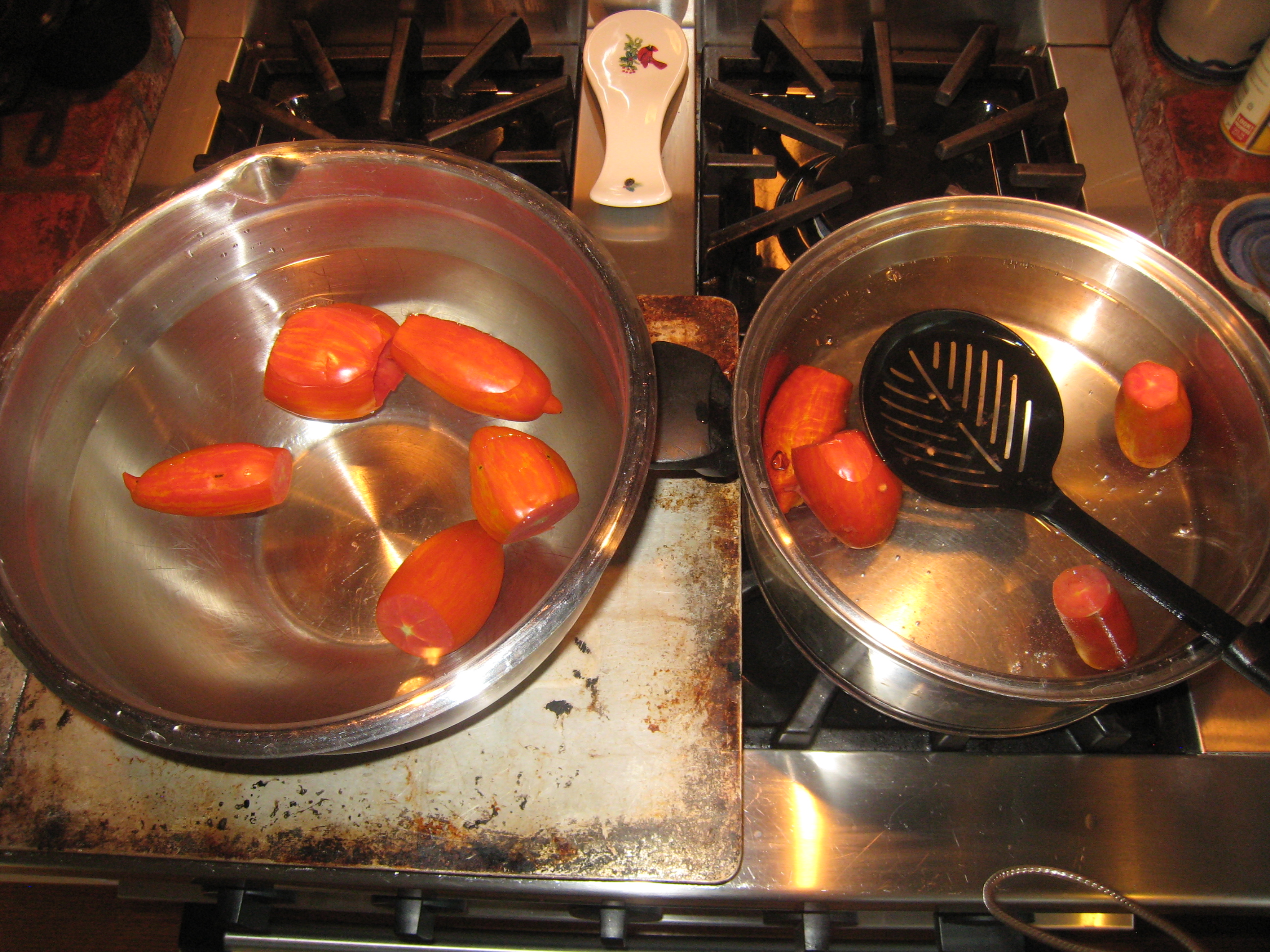 Here’s how the peeling process looks. Notice that I have placed a cookie sheet under the cool water bowl on the left. Lower a few tomatoes into the boiling water. Leave them for about 30 seconds, then use a slotted spoon to move them into the cool water. Put the next several tomatoes into the boiling water. You can peel the tomatoes in the cool water while you wait for the ones in the boiling water. I leave the peels in the cool water and drop the peel tomatoes into another collection bowl.