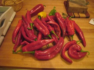 Today the gardener harvested Anaheim chilies and brought the abundance into the kitchen. It’s time to make pepper flakes.