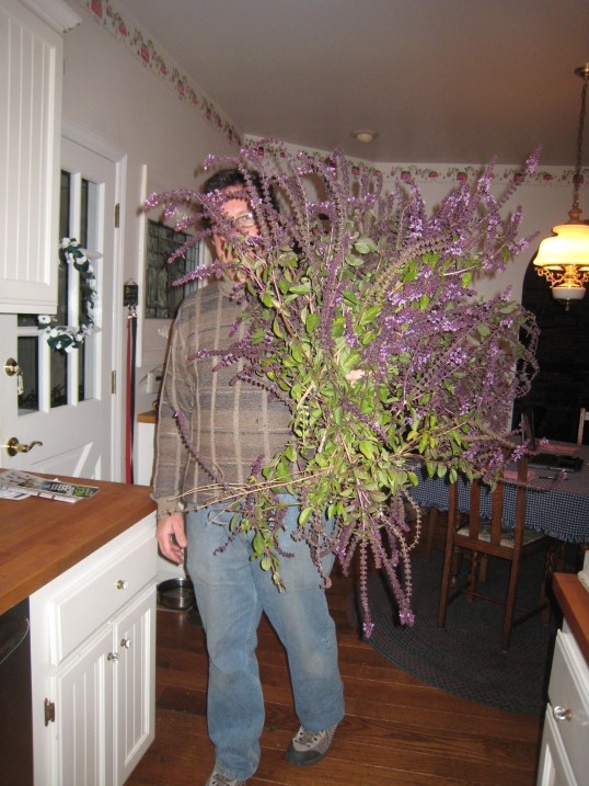 Occasionally this happens. The harvest manager has to help the gardener keep things in perspective. This happened just the other day when the gardener completed the final harvest of Thai basil and brought the abundance into the kitchen.