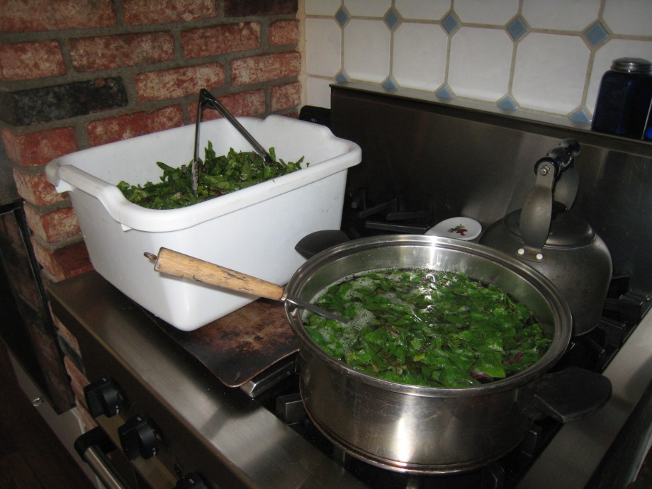 Transfer two or three “tongs full” of greens from the basin to the boiling water to blanch for two or three minutes.