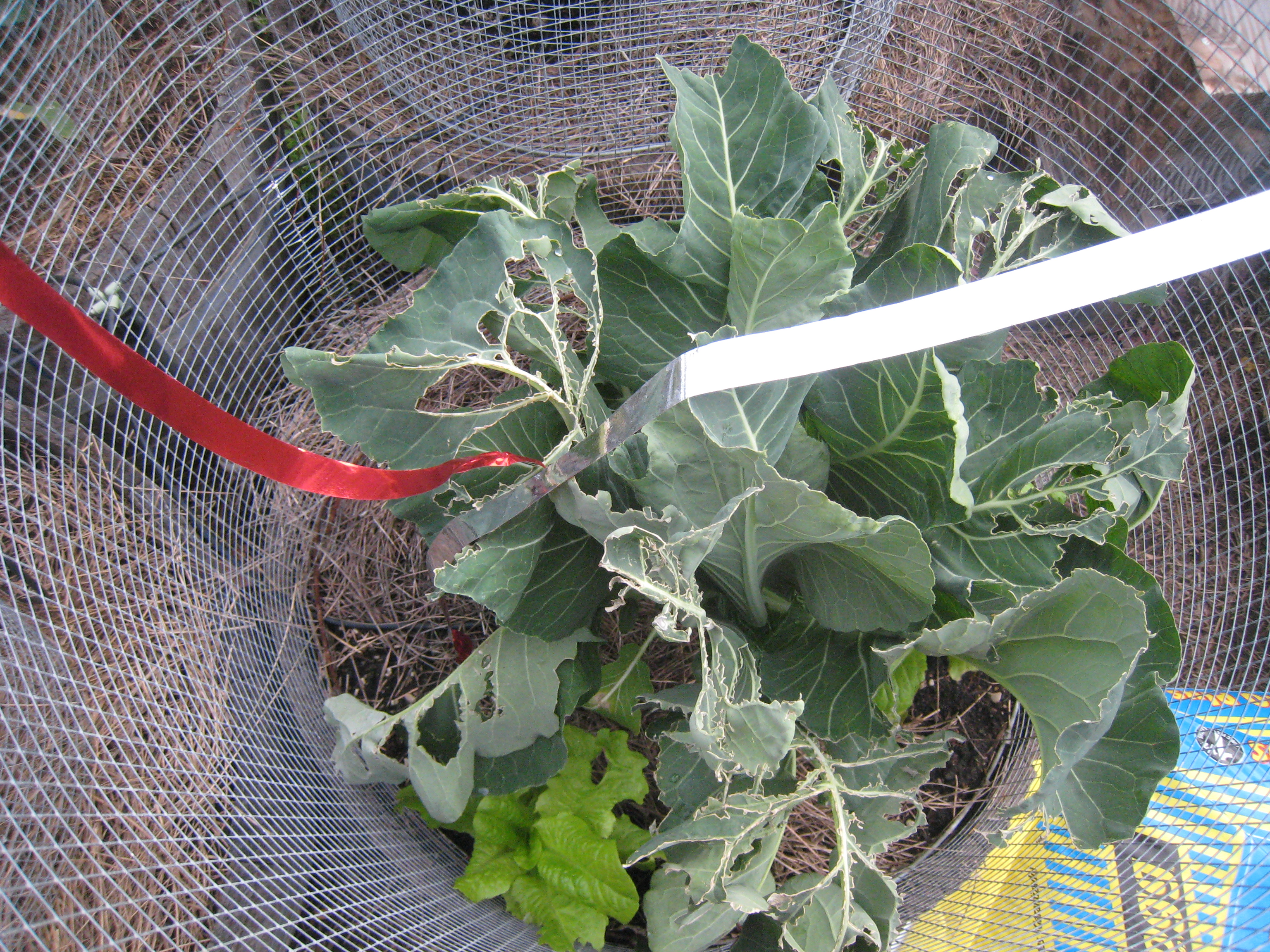 Earlier this week The Gardener acquired a more convincing deterrent. Day and night the fearsome plastic owl stands guard. It seems to help. The birds are keeping their distance, and for now the cole crops are making a comeback. Special thanks to parents of the Harvest Manager for suggesting the owl solution.