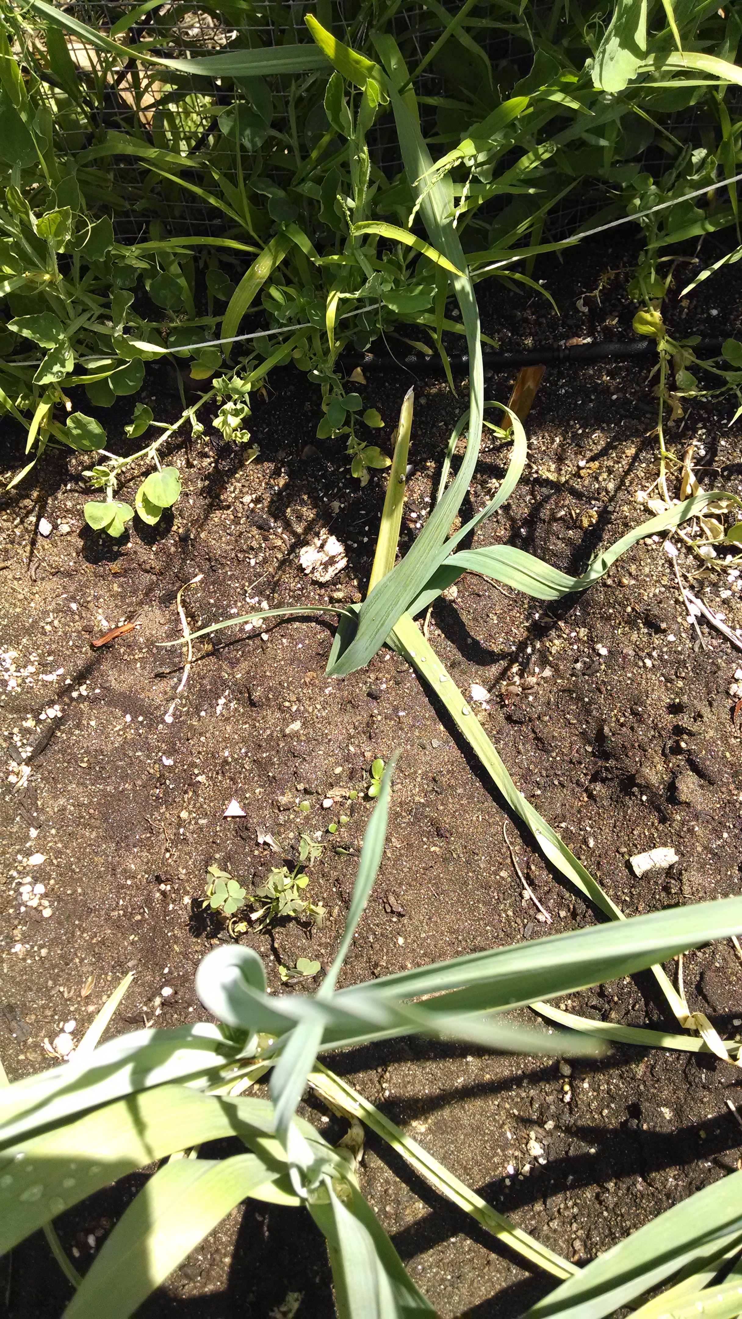 Ordinarily the round, thickening part of the maturing leek stem would be evident at ground level. In this picture (left) we have the flat blade of the upper leaves poking from the dirt. How can this be, you might well ask? Sadly, a gopher has come along from below, eaten off the yummy leek and pulled the plant underground in the process. Sigh.