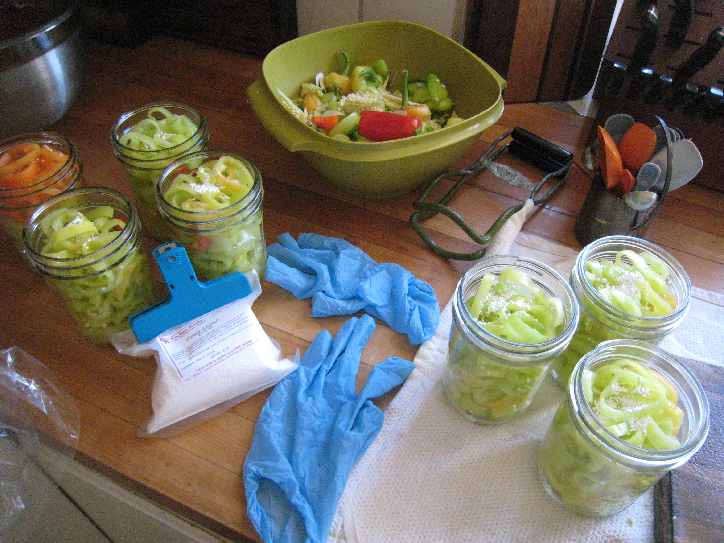 I used the OSU recipe for “Pickled hot peppers” on page 16 of the aforementioned PDF on Pickling Vegetables, adding 3/4 of a teaspoon of calcium chloride to each pint jar. I processed them in a conventional boiling water canner for 10 minutes. I’m going to wait a week or two before tasting, so I don’t know yet how they’ve turned out. I can say they look promising. Stay tuned.